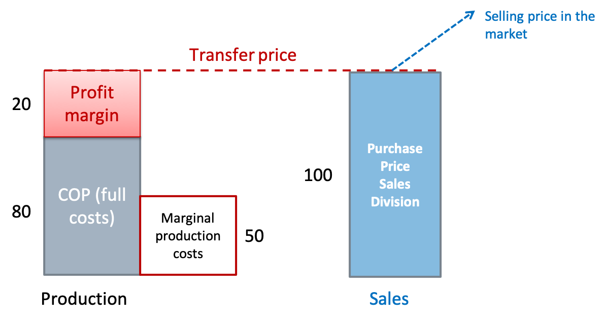 - You also obtain the information that the production division' marginal production costs are GBP 50 per unit (this is how much it actually costs them to produce an additional unit), that the full production costs are GBP 80 per unit (this includes overhead, depreciation, etc.) and that the production division's profit margin is GBP 20 per unit. The following figure summarizes the firm's cost and transfer price constellation: