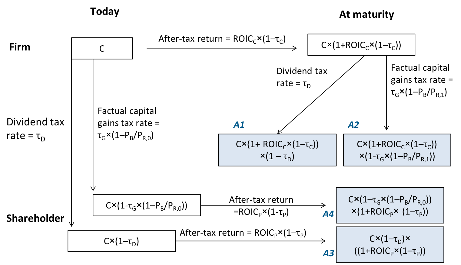 - Since in our example, the corporate income tax rate (38%) is considerably larger than the personal income tax rate (30%), the shareholder's after-tax ROIC (7%) is actually larger than that of the firm (6.82%).