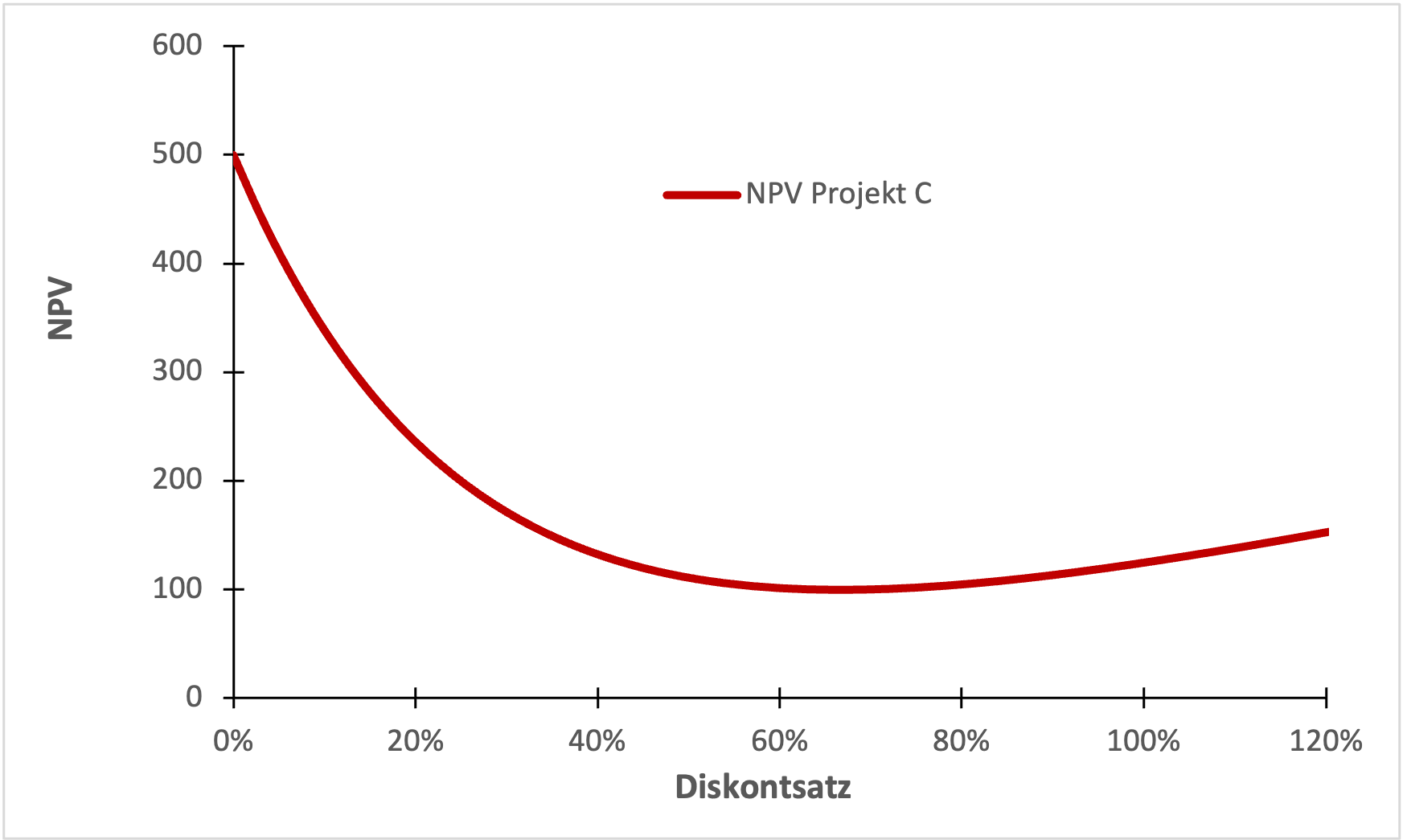 Und dann gibt es Cashflow-Konstellationen, die keinen IRR haben. Dies kann der Fall sein, wenn ein Projekt unabhängig vom angewandten Diskontsatz immer einen positiven oder negativen NPV aufweist.
